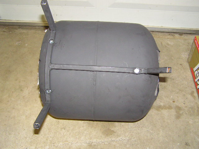 Try to paint all the parts. Wire brush to remove rust, paint and scale and use a degreaser if you are inclined. I use MEK (methyl-ethyl-ketone). Work in a well ventilated area with no open flames and wear protective gloves, goggles etc. Use Bar-B-Que paint, the stuff I buy claims to be good up to 1200 degrees F. I like at least two coats of paint. Use wire to hold the parts and hang them to dry. Put a long rod in the ground and hang the tank (newly cut open “front” down and paint the tank. Paint will smooth out the un-uniform look of things, prevent rust and make the forge look great. DO NOT use a primer … unless you have one for high temperatures.