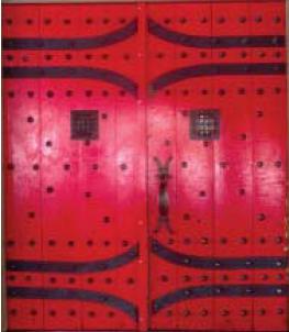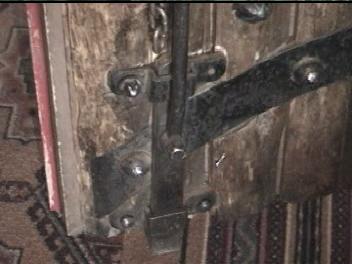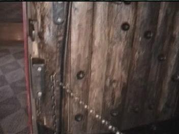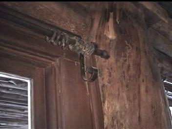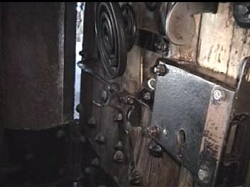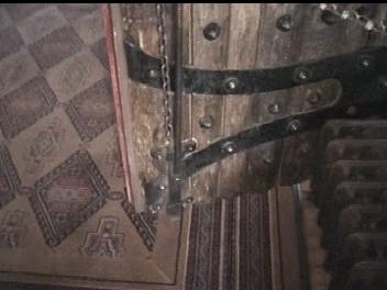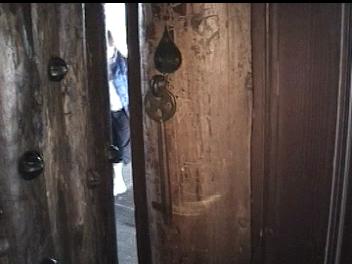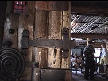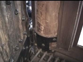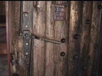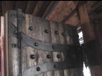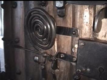 Video of Door ~10 MB 2.1 Minutes The 3"-4" thick door is held together with several dozen rivets with 1.5" heads. The hinges are huge and wrapped around the massive post that form the frame. The major feature for me was on the left side (shown second). On the inside of the door is a 2 tone door bell. The actuator is missing, but the clapper operates in the "cocking" mechaism and the chime really sounded great. I regret that I did not get the sound on the video. There was a hole through the door near the sear, which apparently lead a "trigger" linkage to the sear.