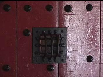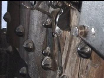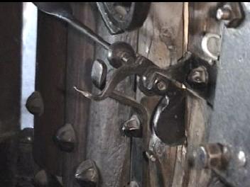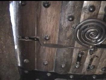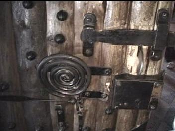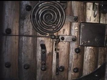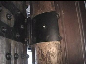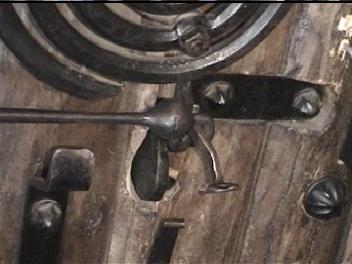 Below are clips from the video (above). They are of the major componenets of the door with most detail of the chime, which is the most unique hardware. If you have any information to add, please e-mail me. I am interested in anything about this door chime or similar hardware.Note that the chime is two spirals. The larger one is attached to the bracket on the door and the smaller spiral is atached to the larger via what appears to be a square headed bolt. The two tone chime suggests a very progressive style. From talking with the blacksmith who refurbished the door some years ago, the "rivets" are lag blots with collars swaged and welded to the heads. Futher the door accuator was left off to avoid the chime being rung some 100,000 times a day by guests. From one of the Reindhart articles (link above) the acutator was at least a cord through the door.